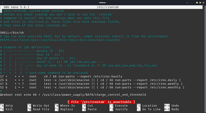@reboot root echo 60 > /sys/class/power_supply/BAT0/charge_control_end_threshold